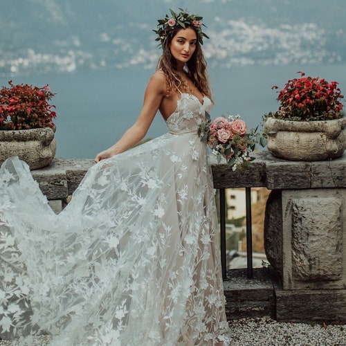 Bohemian 3d Lace Detailed Summer Wedding Dress Open Back And Etsy