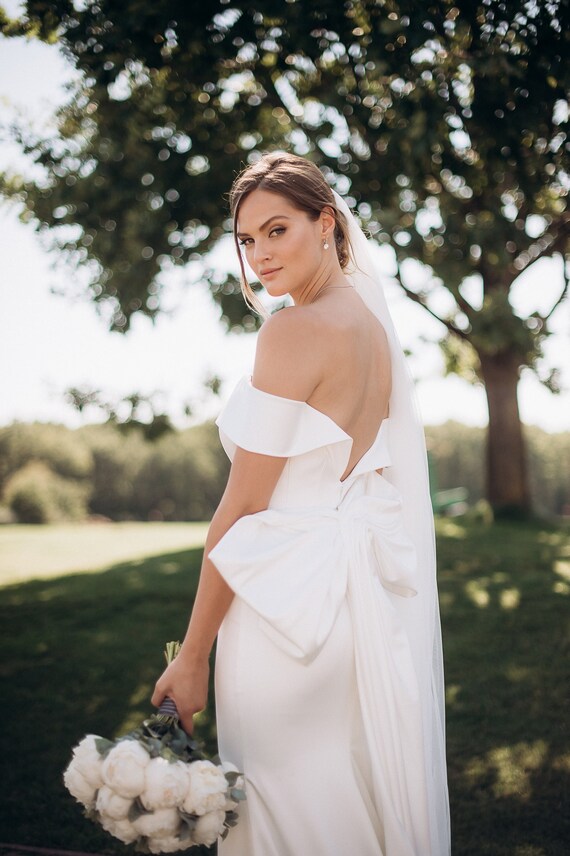Satin Off The Shoulder Wedding Dress With Bow Sheath Etsy Canada